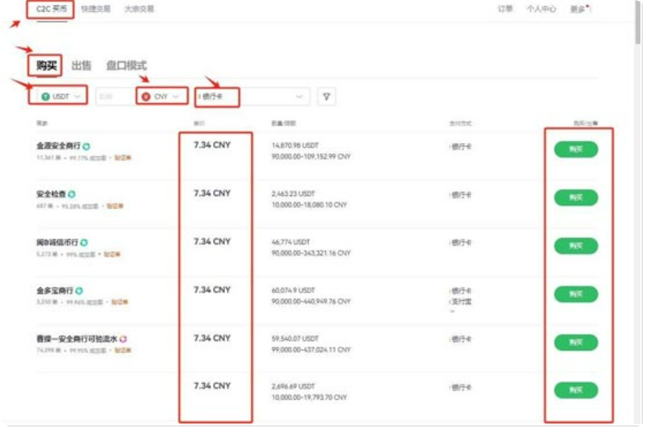 9、进行交易前需要拥有USDT，可在C2C买币进行交易，根据需求选择合适商家，点击“购买”，而后根据提示进行付款、等待商家放币(若是长时间没有收到币种，可联系客服进行处理)