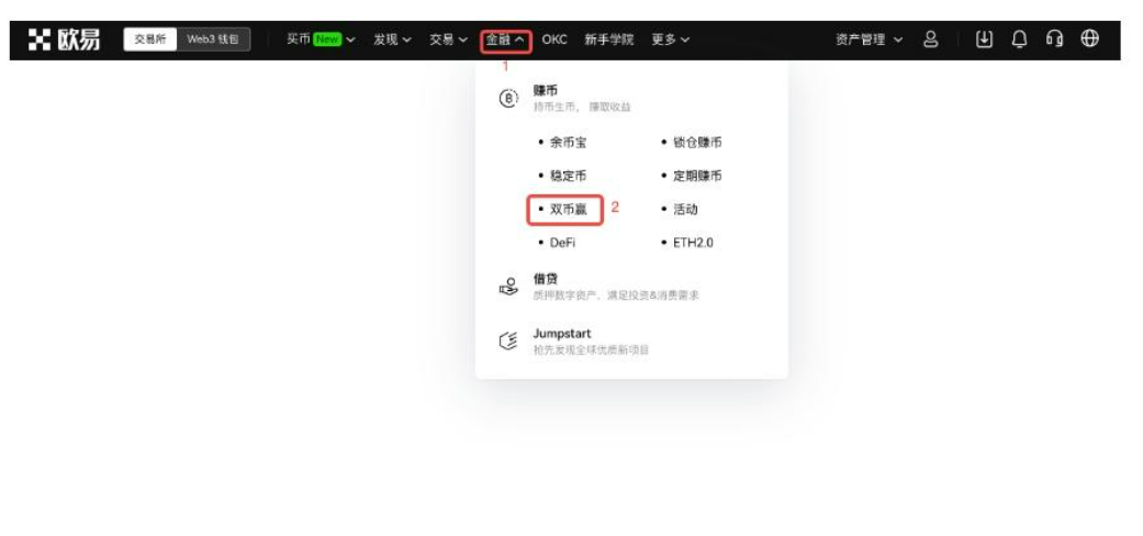 双币赢有风险， 双币赢就是双币理财，是一种金融衍生品，有点类似于传统金融的选择权。 投资人投入某一种加密货币，并设定三个参数：「标的物」、「到期日」与挂钩价。 当时间到达「到期日」时，平台会根据该加密货币当时的结算价格结算，不论有无达到先前设定的「挂钩价」，投资者都可以赚取利息收益。以下是在欧易交易所参与双币赢的教程：