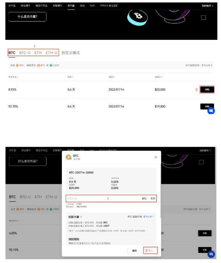 2、选择产品类型、投资资产以及具体的双币赢产品，点击【申购】—输入投入金额—【确认】，按要求完成操作。
