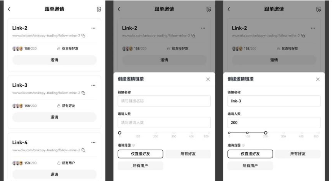 点击“创建链接”按钮即可生成新的邀请链接,您可以自定义链接以下内容: 链接名称:设置独特邀请链接名称 邀请人数:该链接的可邀请的最大人数。若邀请人数超过上限,用户将无法通过该邀请链接进行跟单。 邀请范围:可以使用该链接进行跟单的用户范围 直接好友:指交易员节点计划下直接关联的好友 所有好友:指交易员节点计划下直接关联的好友及其下级好友 所有用户:所有跟单用户,包括未通过节点计划邀请的用户 配置了以上信息后,点击“确认”按钮即可生成邀请 链接,并进行分享