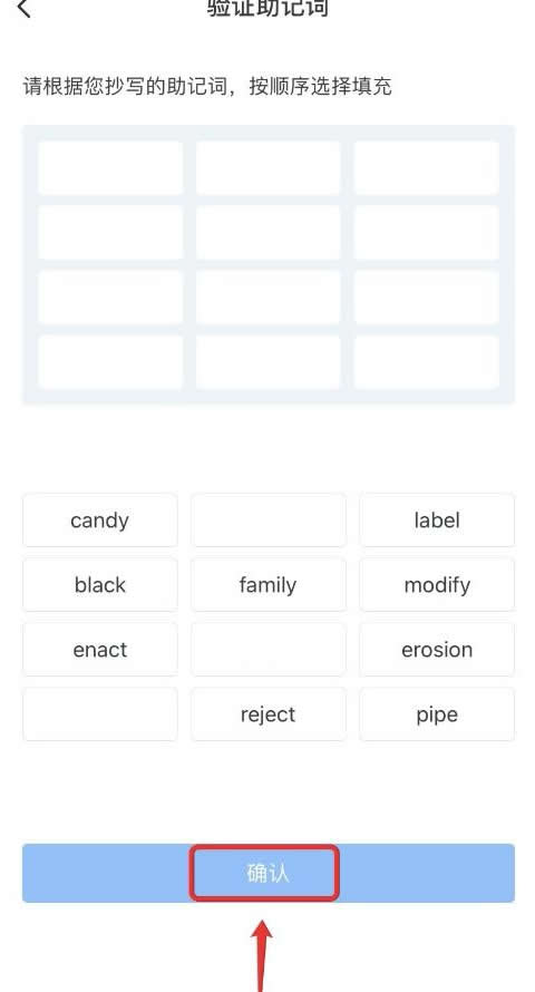 6、按照上一步的助记词顺序填入，然后点击【确认】