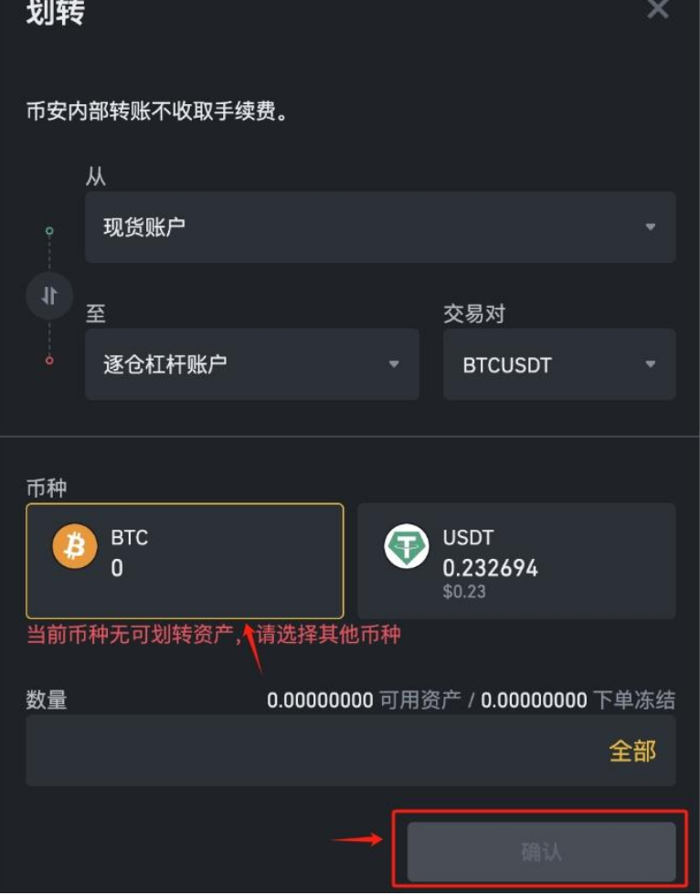 4、在弹出的转账页面，确认从“现货账户”转到“逐仓账户”(如BTCUSDT逐仓账户)，选择币种和数量，点击【确认】。