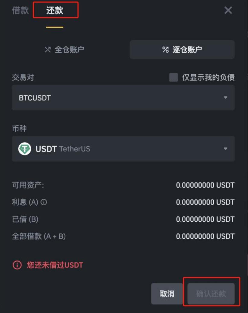 9、在弹出的借/还款页面，切换到【还款】页，选择币种和需要归还的数量，点击【确认还款】。