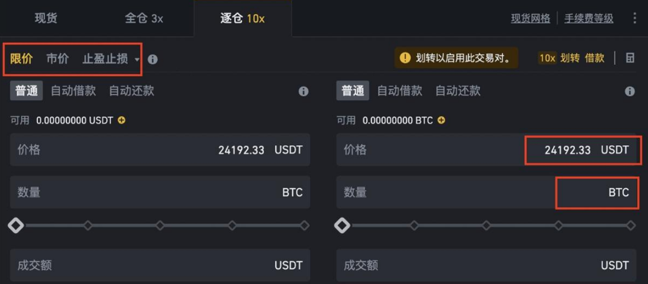 7、如您预期未来行情会下跌，您可以选择借入数字资产高价卖出，未来再低价买入并还款。具体操作：在交易面板，点击订单类型(限价、市价、OCO或止盈止损)，选择交易模式【普通】。输入卖出价格和数量，点击【卖出】。