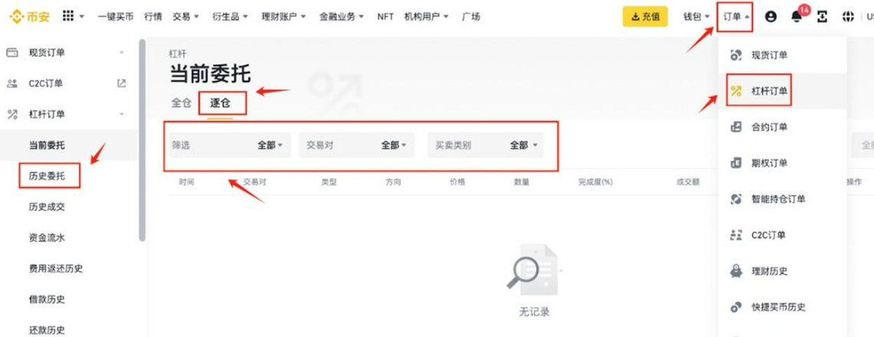 11、在顶部菜单【订单】-【杠杆订单】进入杠杆订单界面。选择【逐仓】，可按时间、交易对(如BTCUSDT)和买卖类型过滤交易对，查看历史委托订单。