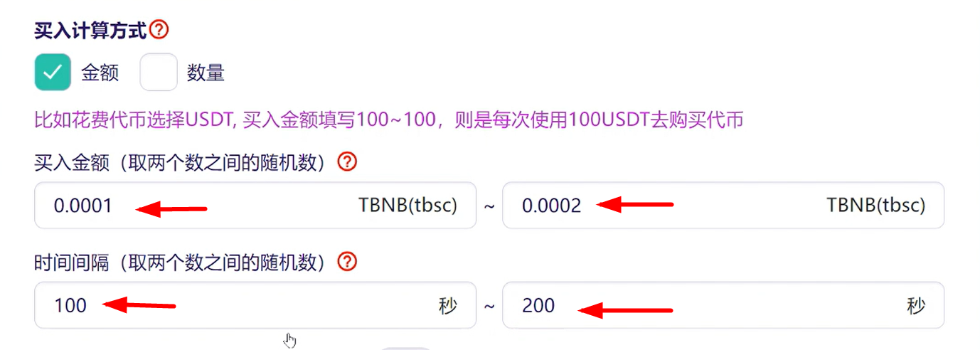 * **买入金额（取两个数之间的随机数）：**&#x30;.0001 TBNB\~0.0002TBNB （如果填写100\~100，则表示每次使用100TBNB去购买代币；如果填写100\~200，则是取100\~200之间的随机数量的TBNB去购买代币）