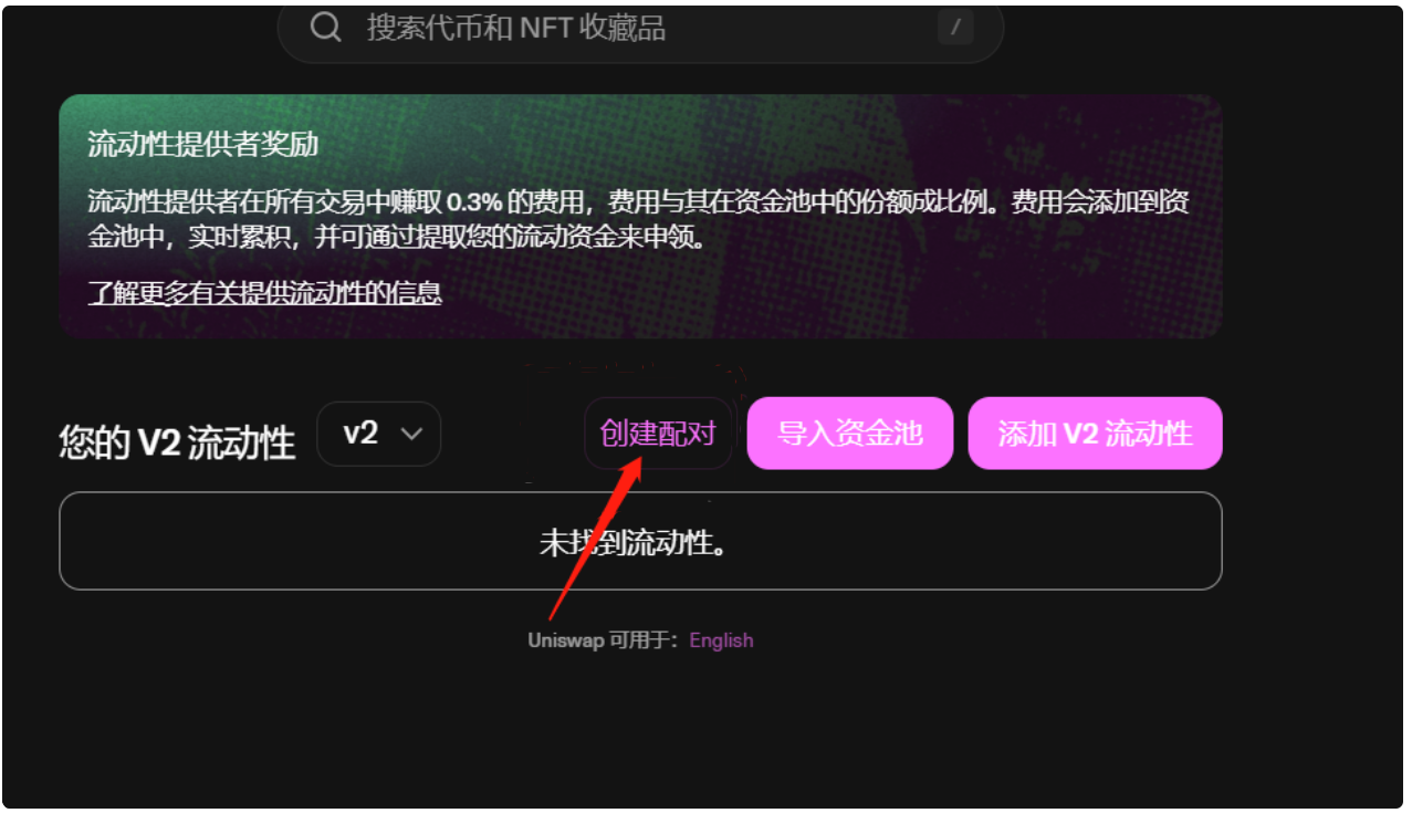 打开V2的页面中，可以看到已添加的流动性（如果之前没有加过流动性，就显示：未找到流动性），增加V2流动性或创建配对。