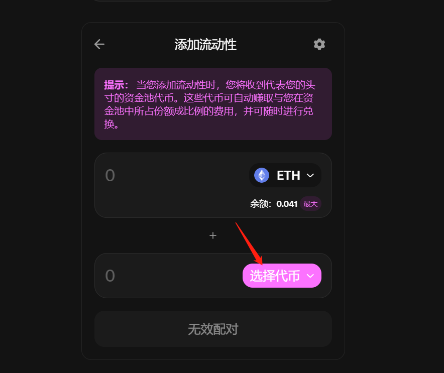 在已添加加池页面里，通过合约地址查找代币，并使其与ETH配对。