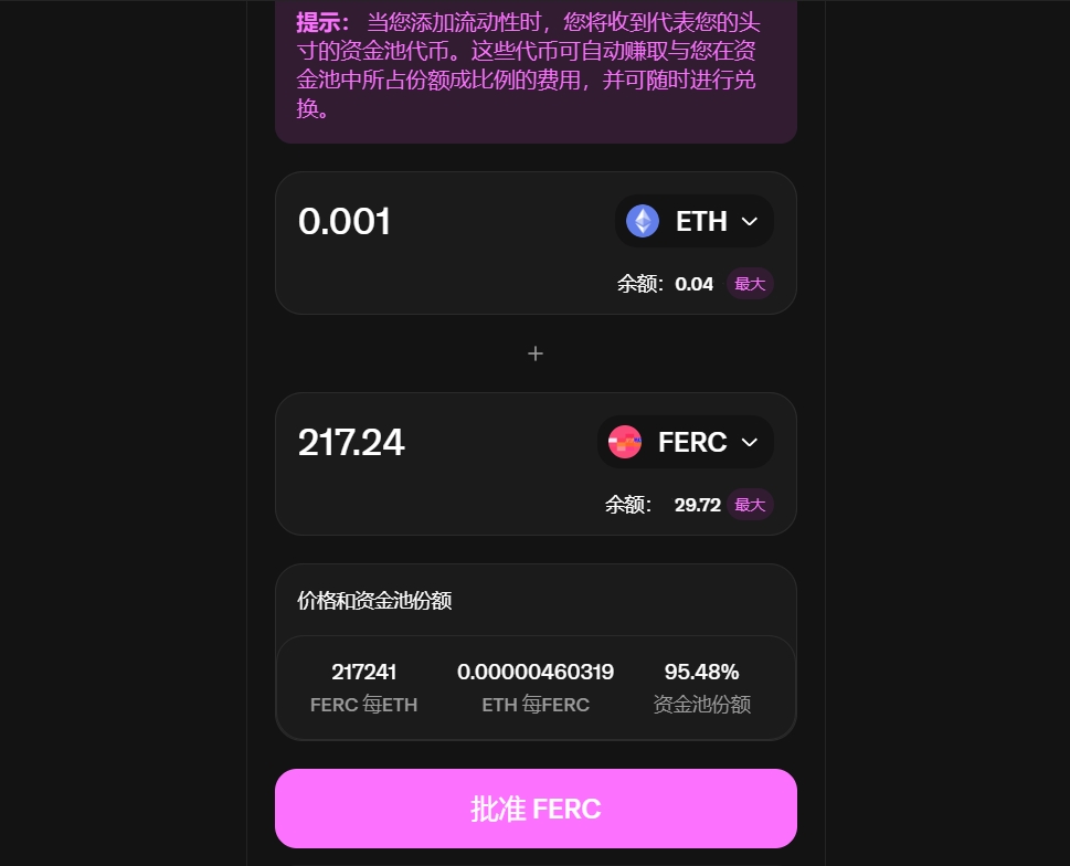 选择ETH与FERC这个代币配对，上面输入ETH的数量，下面输入FERC的数量。