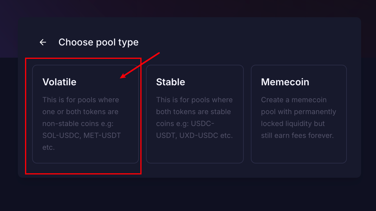 打开之后,会让你首选选择资金池类型。Volatile 就是正常的代币池,默认都选这个。Stable 是稳定币资金池,如果你不是稳定币,不要选,Memecoin会永久锁定流动性的,按需求选择。