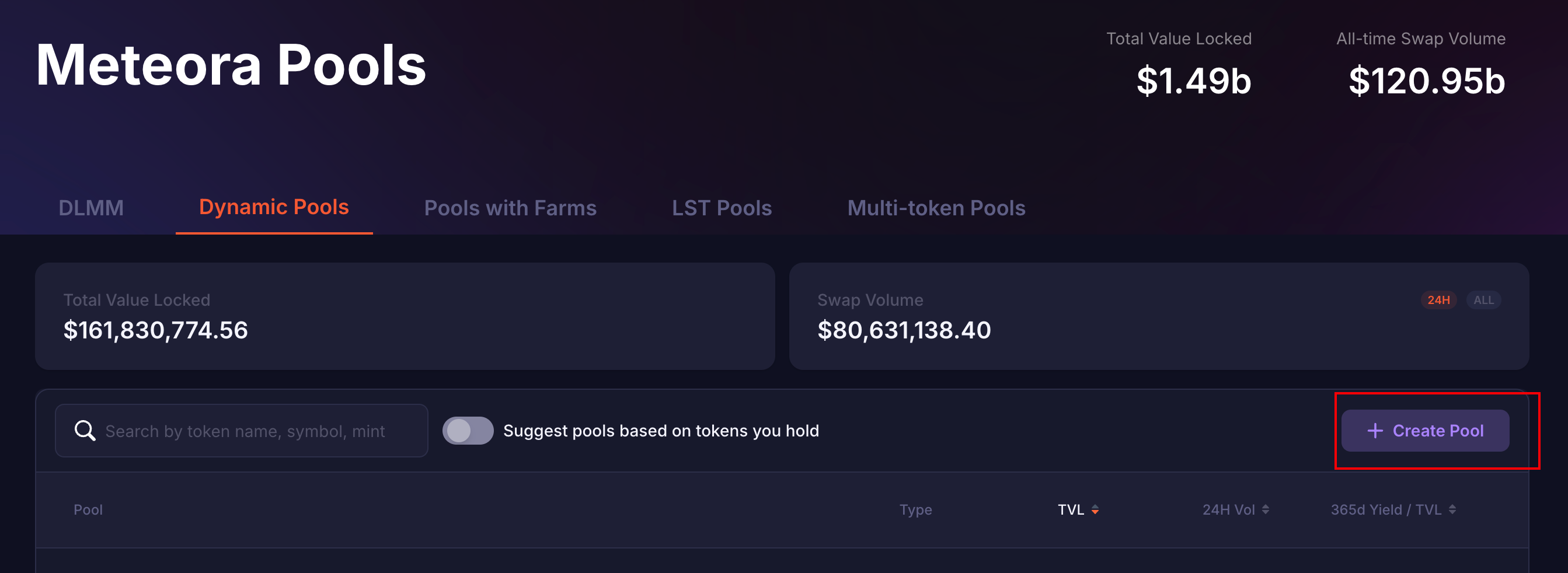 打开Meteora的官网:https://app.meteora.ag/#dynamicpools 中间的位置找到“Create Pool”,点击之后开始创建资金池。