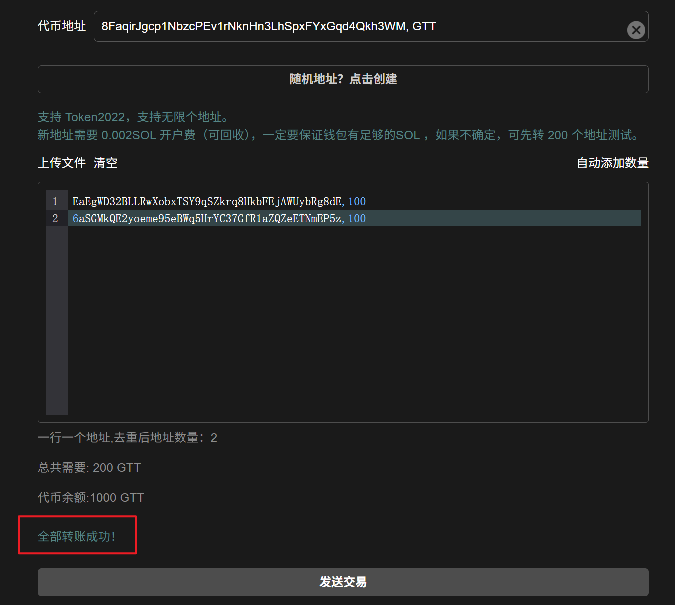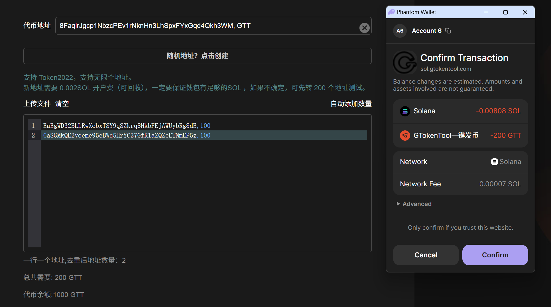 GTokenTool Sol批量转账/空投工具一次签名转380个地址，1000个地址只需签名3次。具有自动去重功能，市面上最好用的批量转账/空投工具。