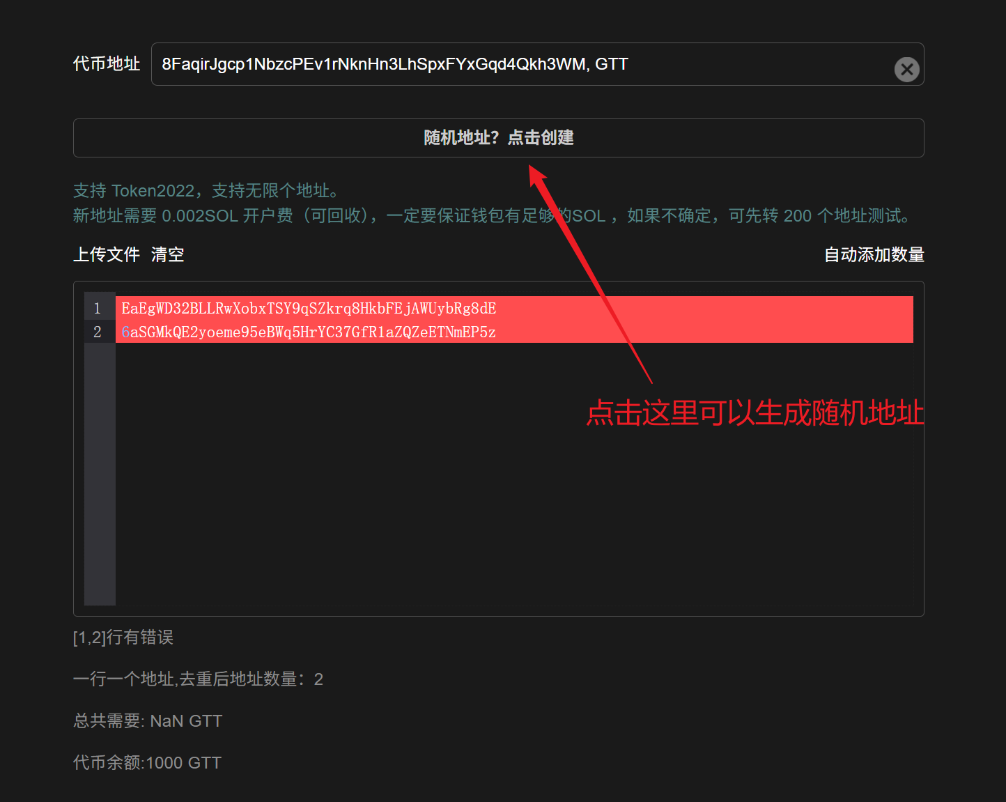 在输入框中输入要转账的地址或者点击“`随机地址？点击创建`”，用英文逗号隔开（<mark style="color:purple;">最多不超过20个地址</mark>）。