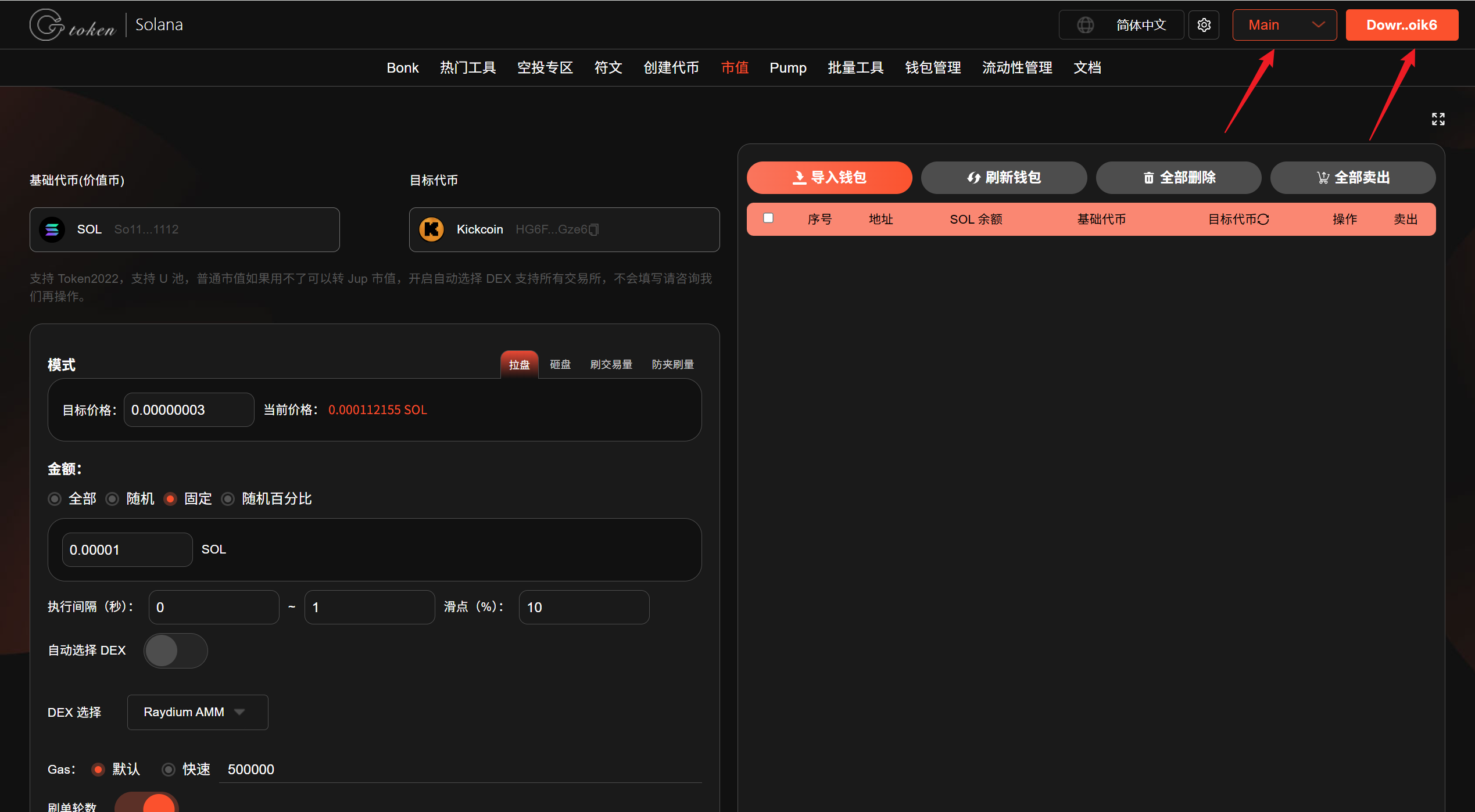 金额:在拉盘模式下,这里的金额就是你所花费的SOL数量。在砸盘模式下,这里的金额就是你要出售的代币数量。