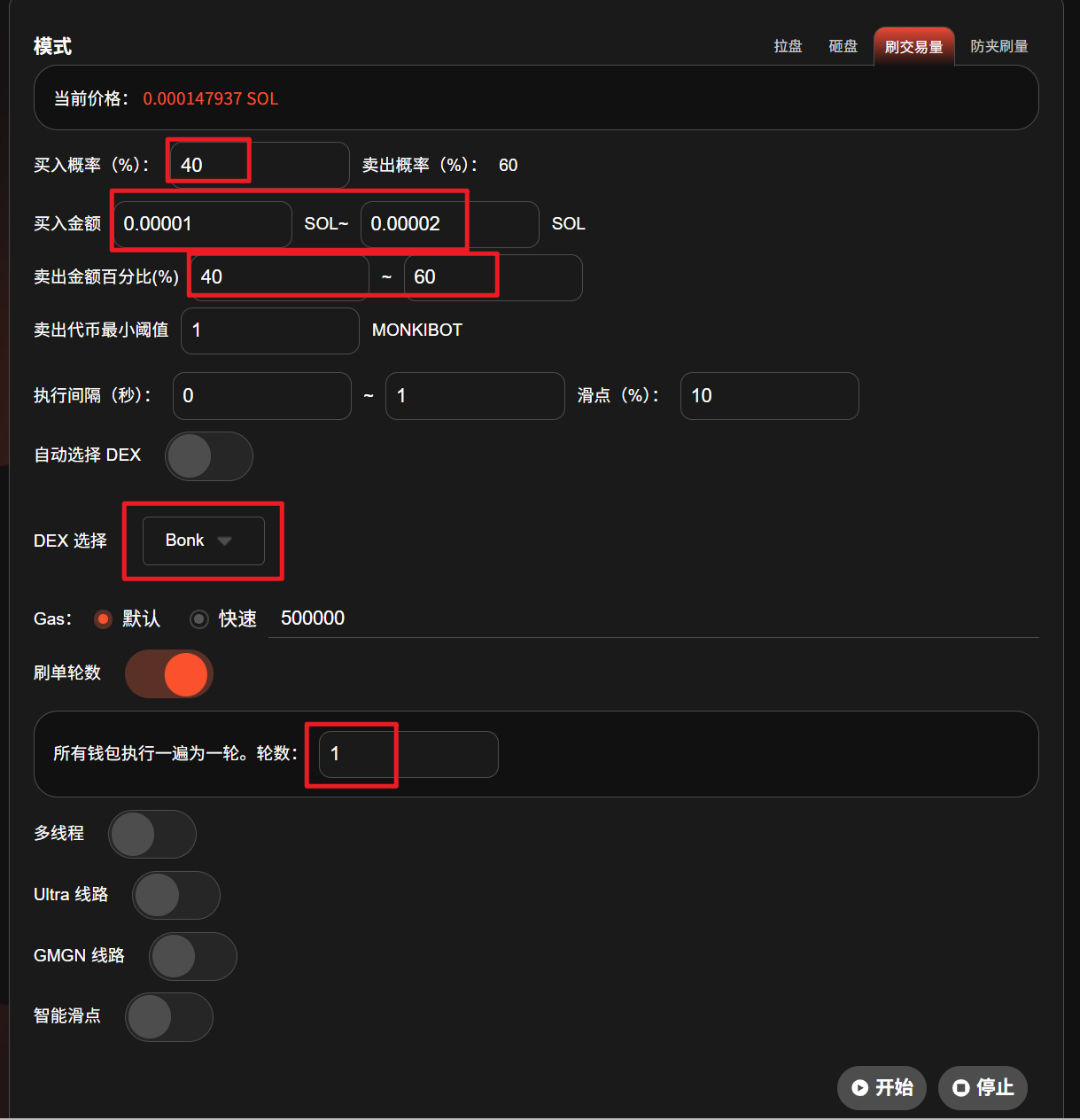 刷单轮数:设置交易次数。若设置了这个,则到指定次数会自动停止交易,无需手动停止。所有钱包执行一遍为一轮。