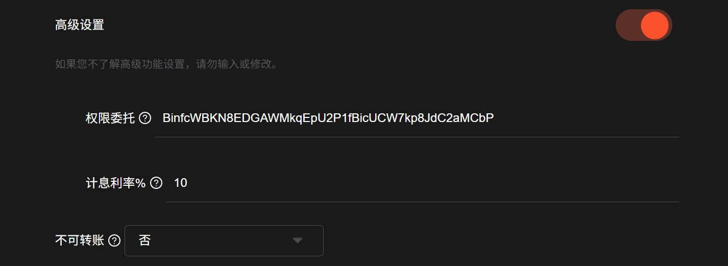 **计息利率%(0.00 - 100)**：为您的代币设定利率，模仿债券等现实世界的资产，并随时获得利息。需要先设置交易费率。