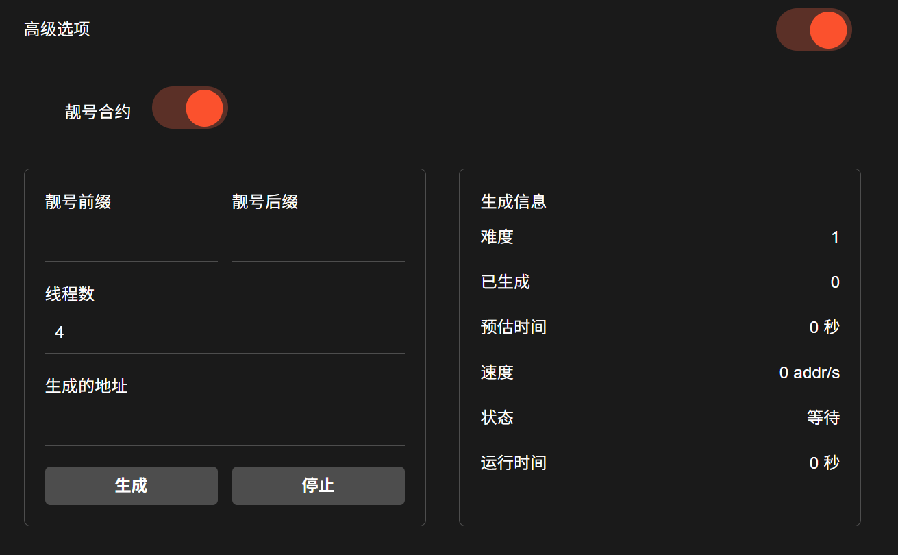 <figure><img src="https://1523574308-files.gitbook.io/~/files/v0/b/gitbook-x-prod.appspot.com/o/spaces%2FaUD1j15UCzdjC6ftyzSr%2Fuploads%2FKegbAaGRSIys63aRGFiw%2FSnipaste_2025-08-23_15-24-43.png?alt=media&#x26;token=06ef048b-d9fe-4298-a0ad-e17176d1fdd4" alt=""><figcaption><p>靓号合约生成</p></figcaption></figure>