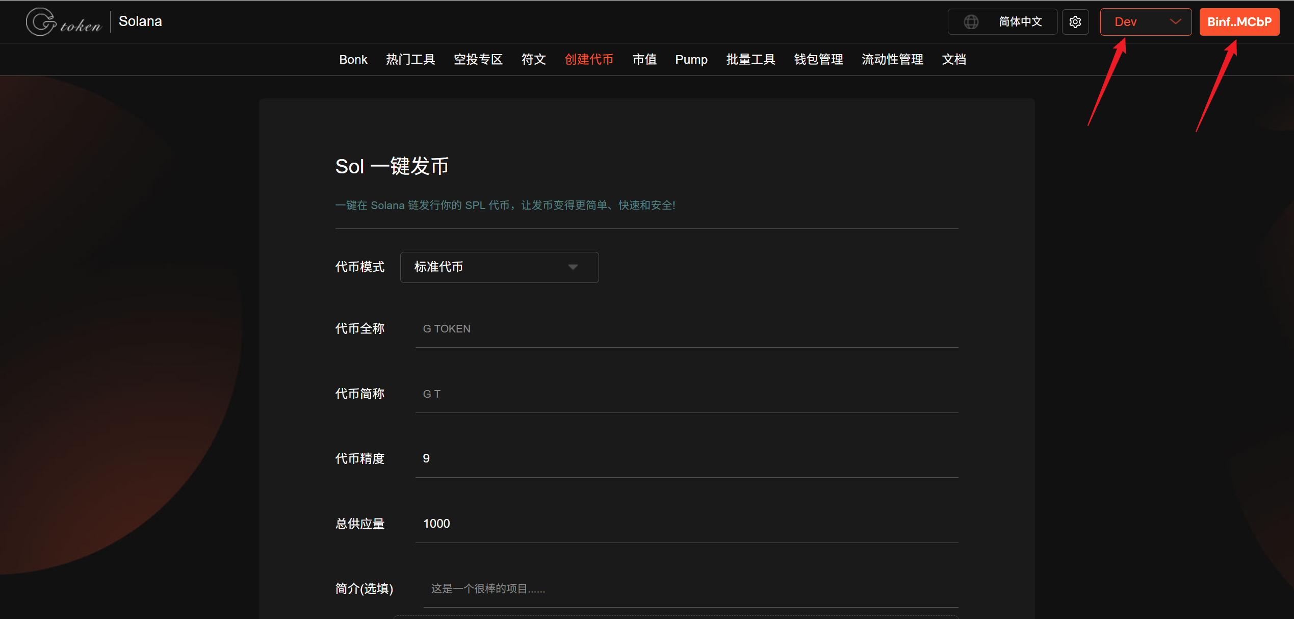 打开发币链接地址：<https://sol.gtokentool.com/zh-CN/Token/createToken>