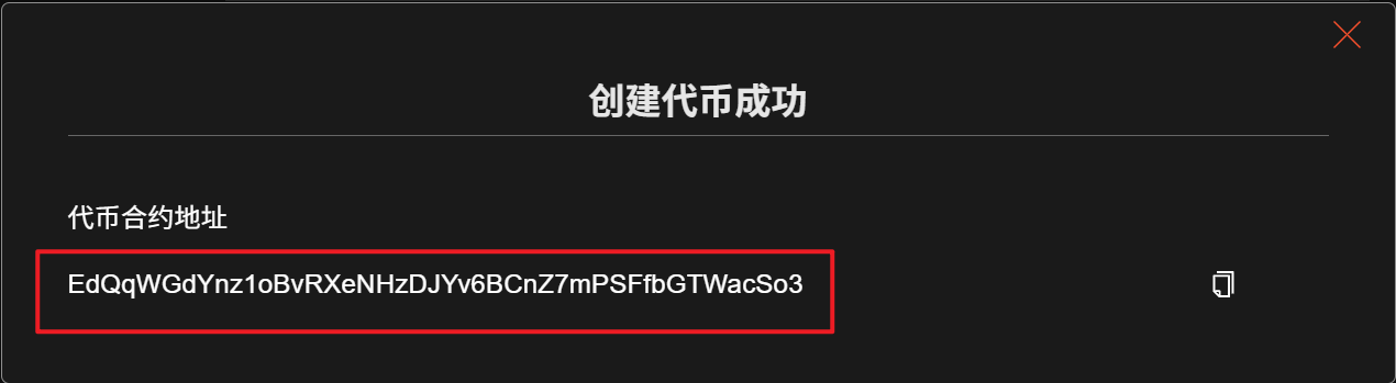 创建成功后会弹出一个提示框提示创建成功，并展示你的代币地址。