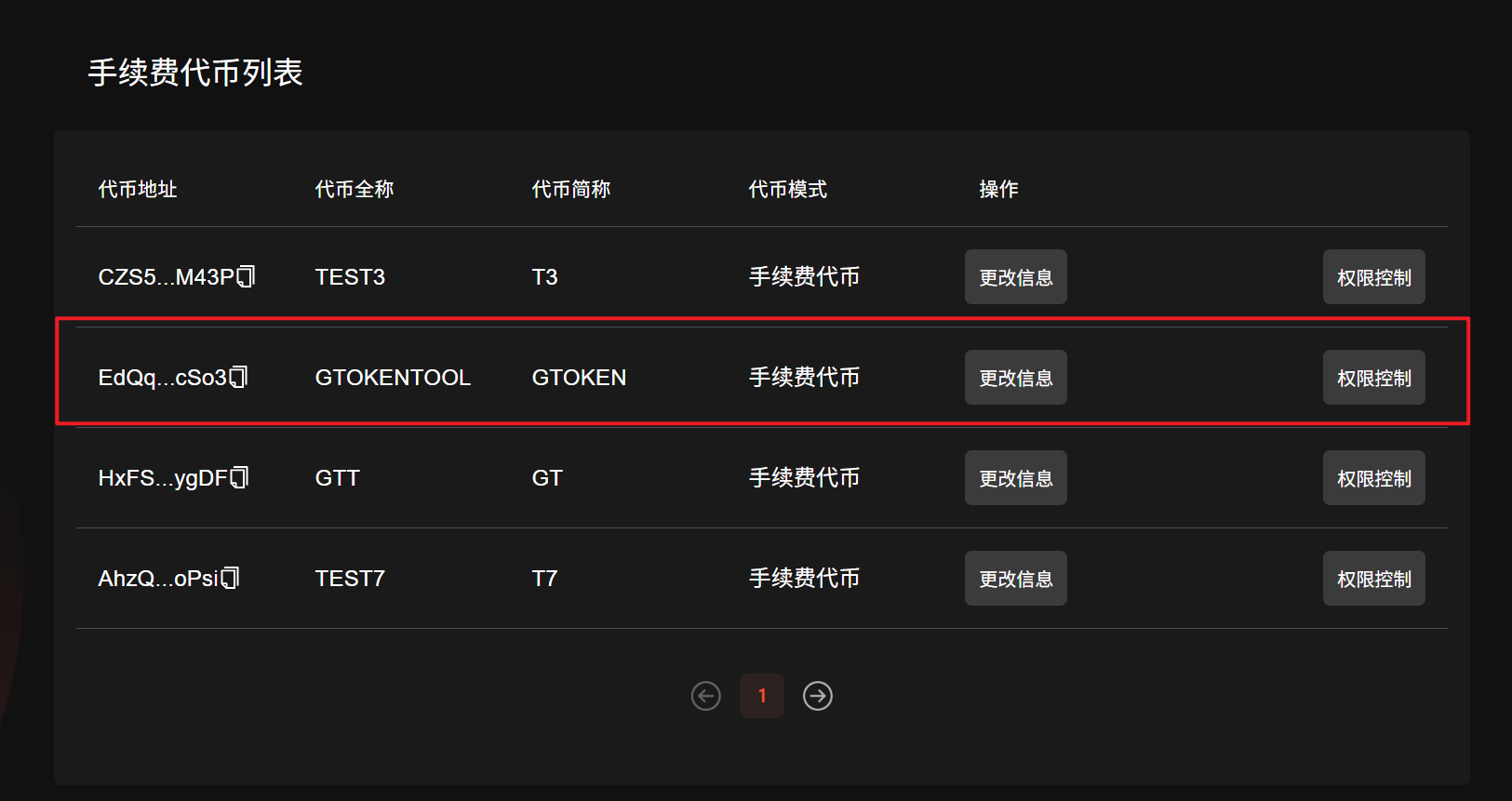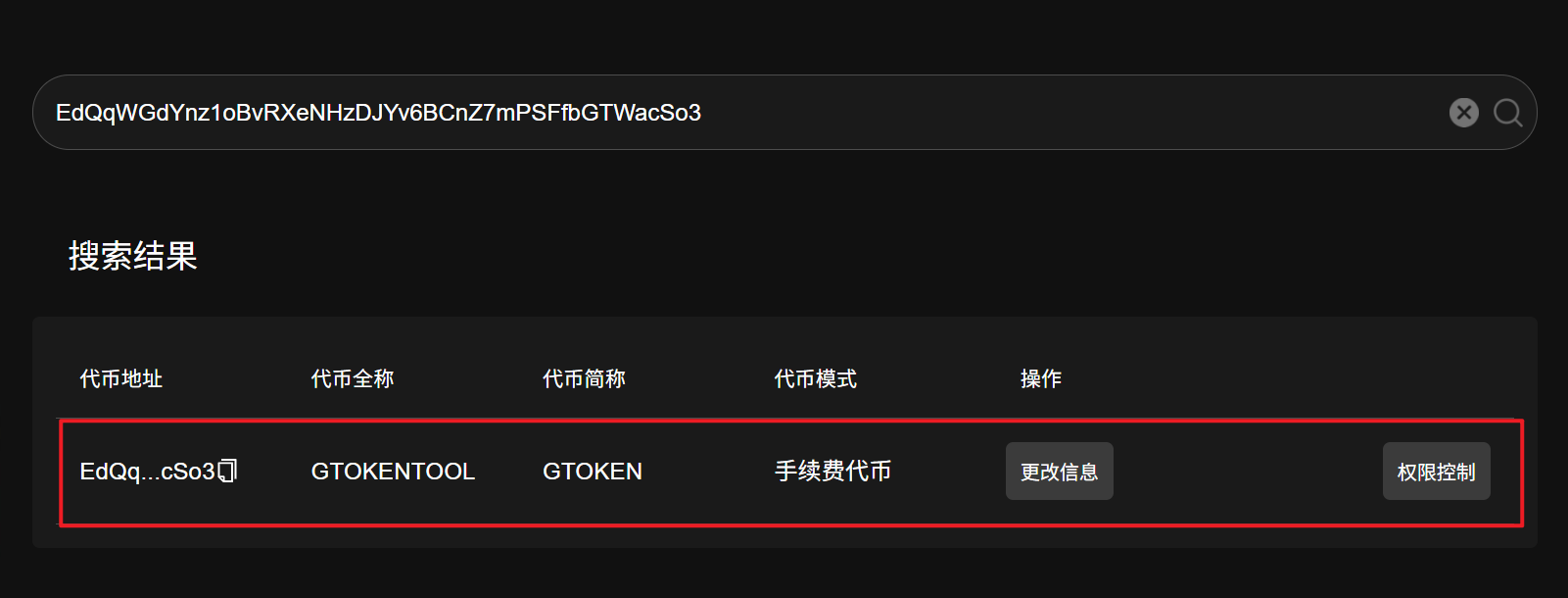 创建成功后可以前往`管理代币`，在手续费代币列表下可以找到刚才创建的代币，可以进行进一步的Solana发币管理。或者直接在上方的搜索框内输入代币地址进行查找。