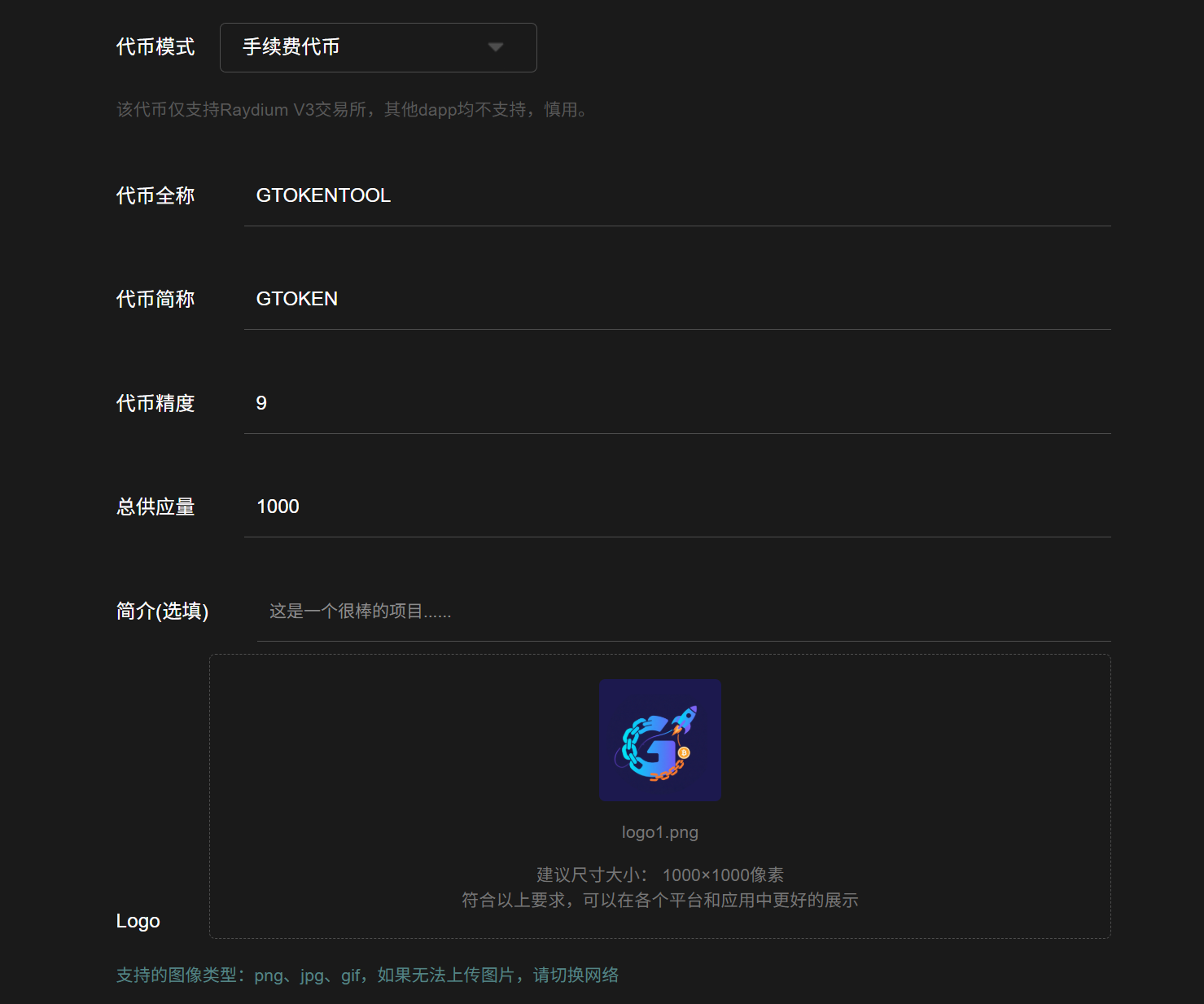 **Logo：**&#x4EE3;币头像，可在钱包中显示logo代币图片（上传图片大小最大不超过2M）。