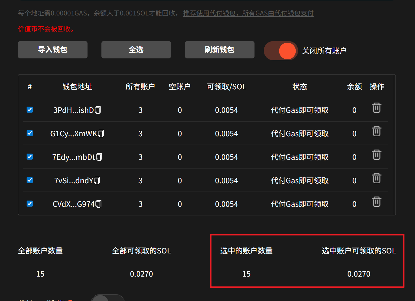 <mark style="color:purple;">导入钱包后，可以查看钱包地址、所有账户数量、空账户数量、预估可回收领取的 SOL 数量以及领取状态。</mark>