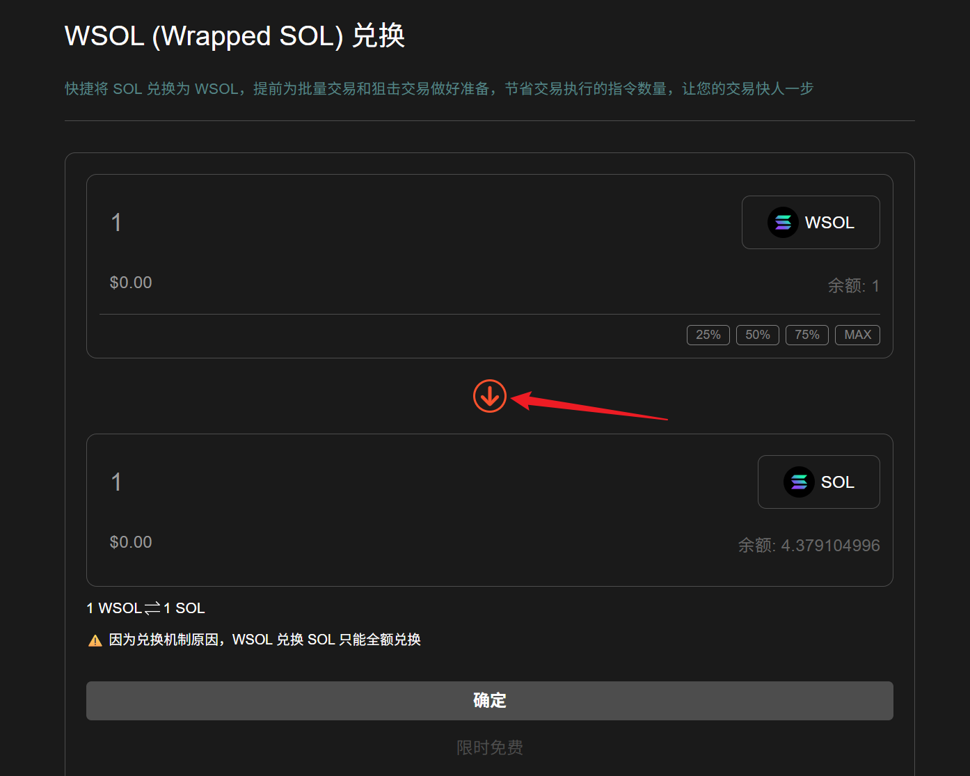 点击中间的切换按钮，切换到 WSOL 兑换 SOL。