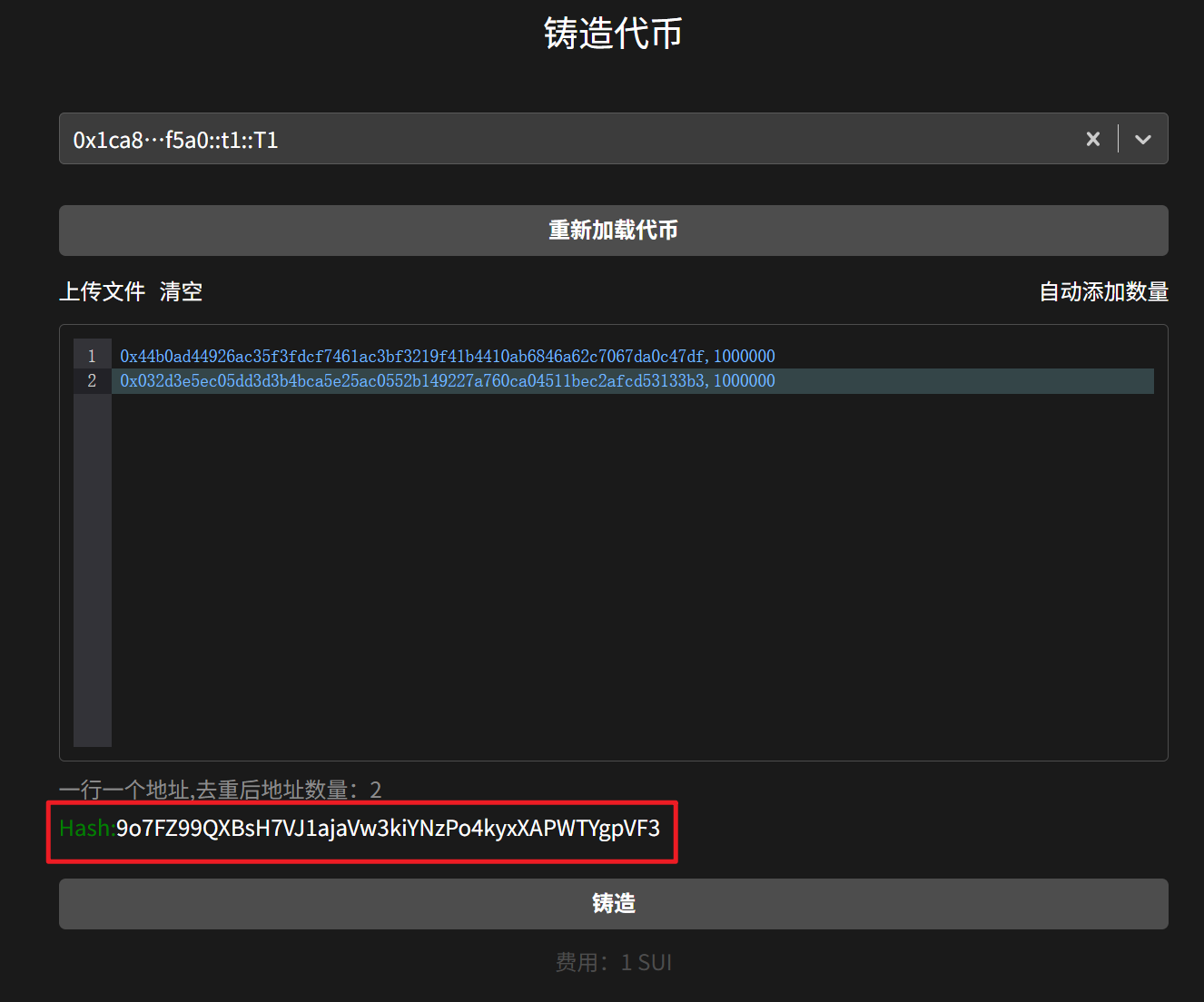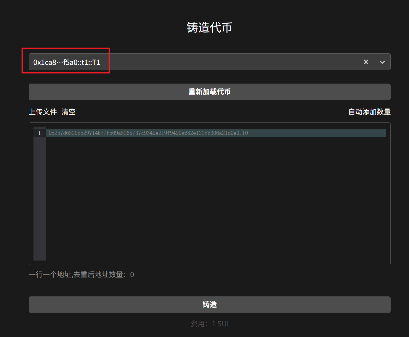 选择代币后，可以在下一行输入框内依据示例输入地址和代币数量（**注意代币精度**），可以为其他地址铸造，也可以有多个地址。