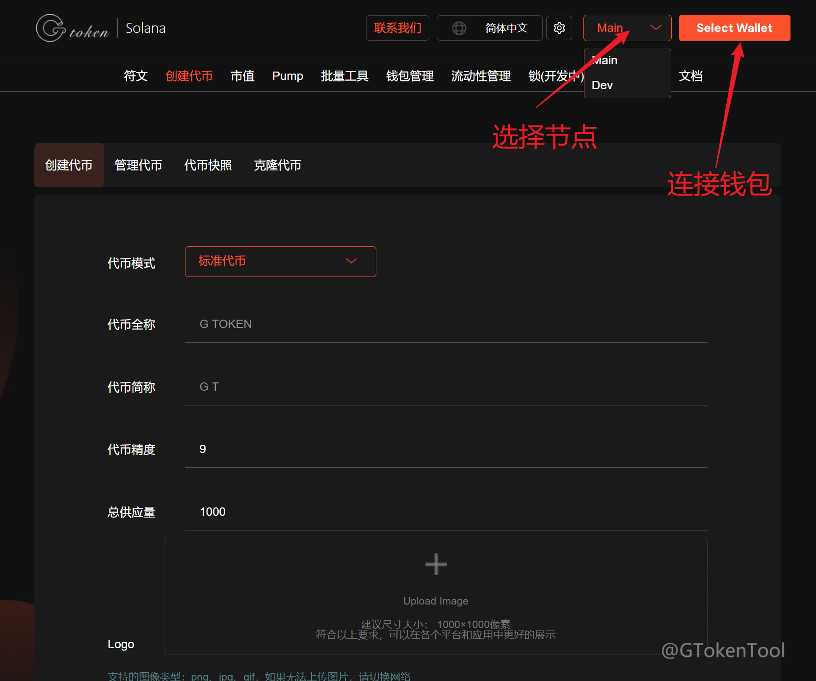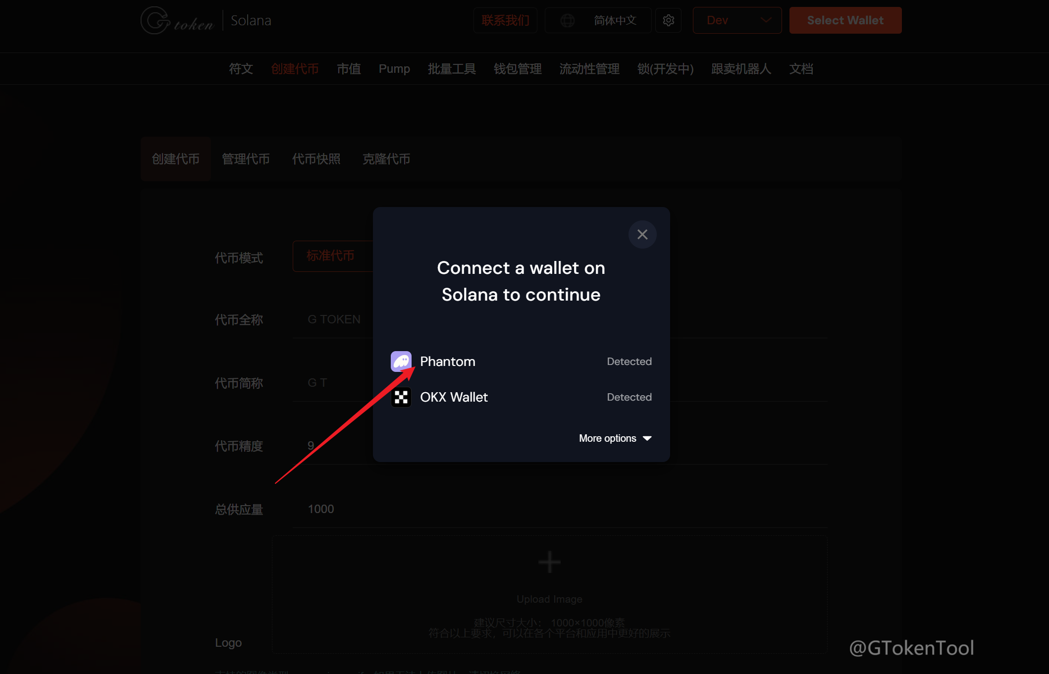 打开Solana发币链接地址:https://sol.gtokentool.com 点击连接钱包,并选择你的节点。