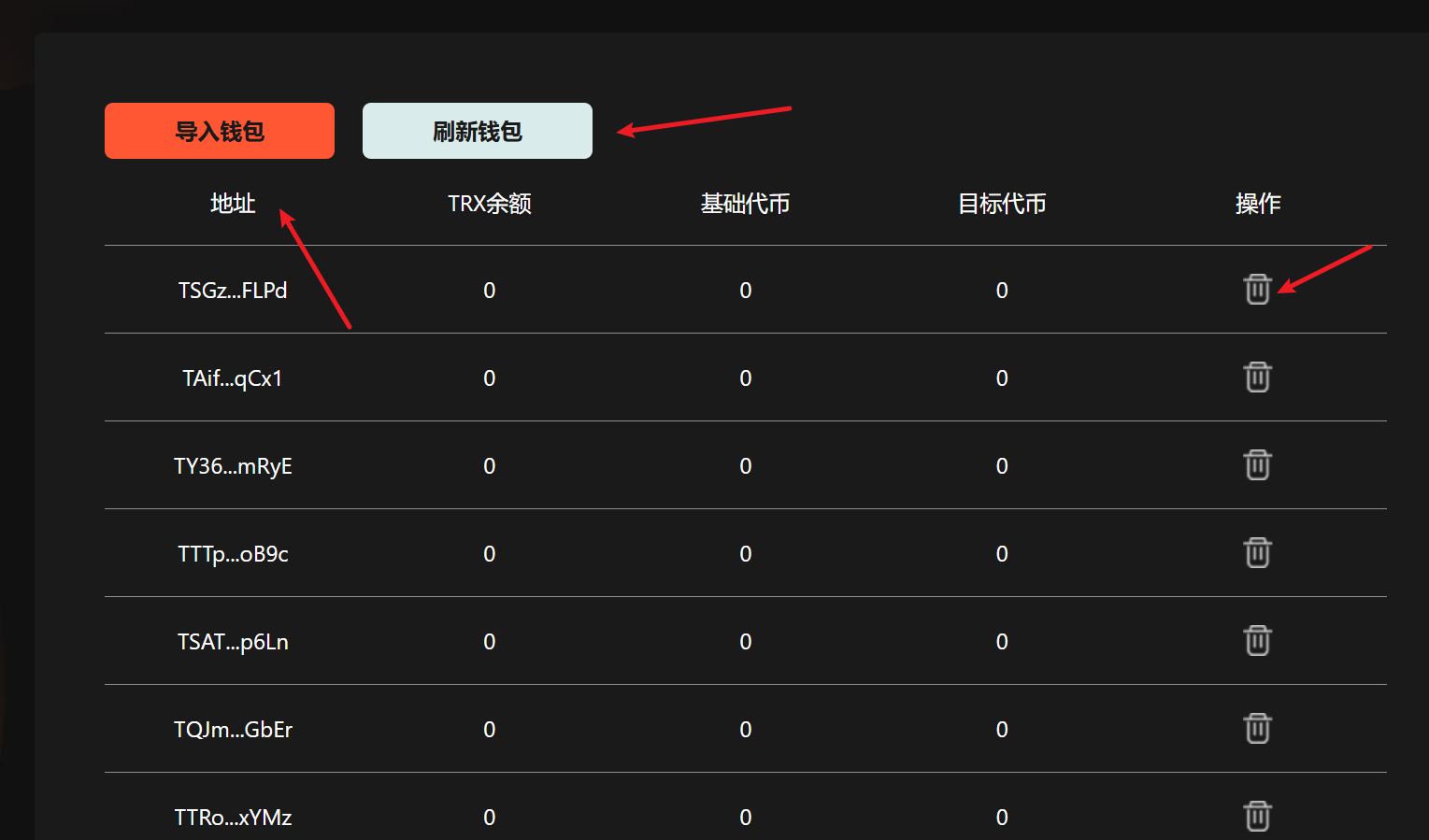 导入批量钱包，查询钱包余额，点击刷新钱包可刷新钱包的余额，点击删除操作按钮可删除钱包。
