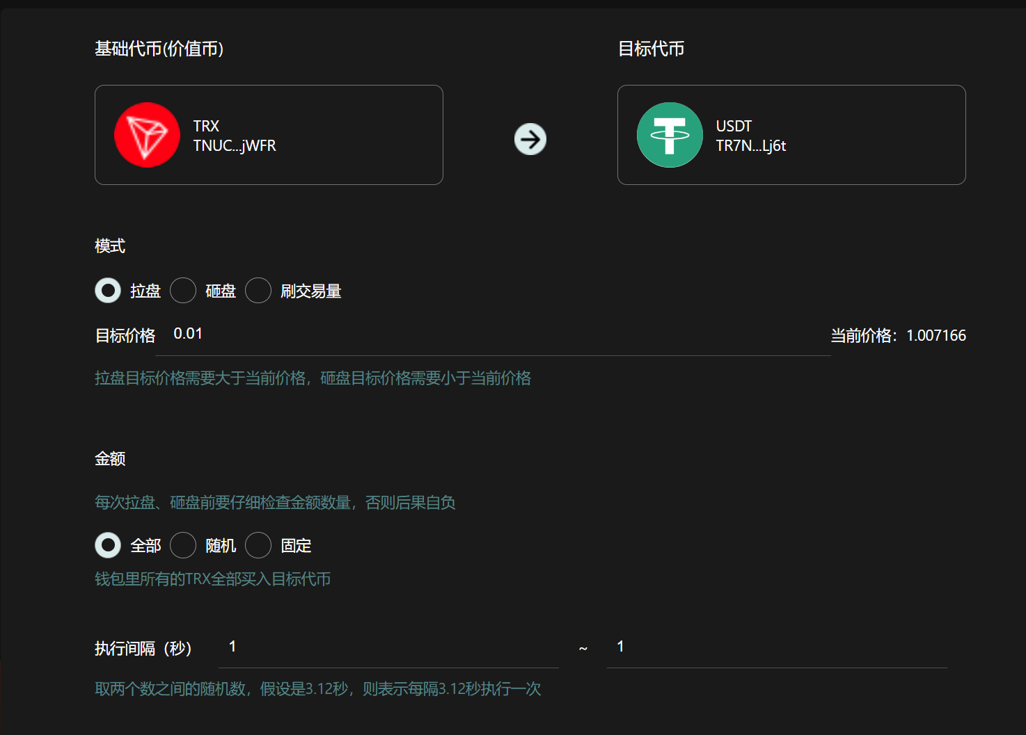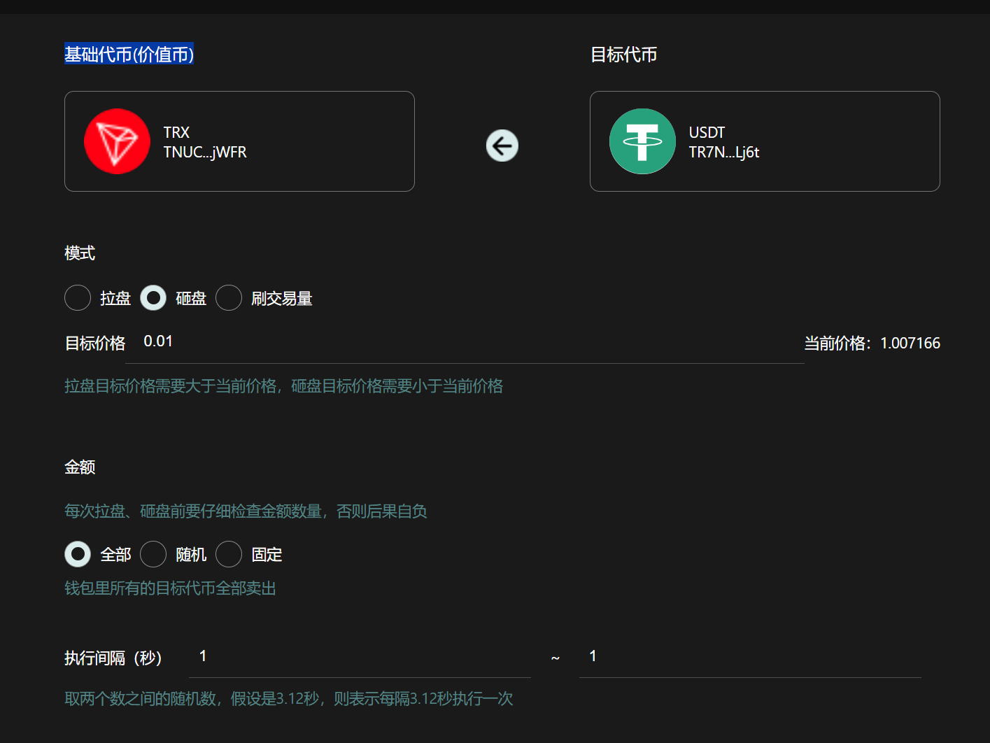 **金额：**&#x5728;拉盘模式下，这里的金额就是你所花费的TRX数量。在砸盘模式下，这里的金额就是你要出售的代币数量。